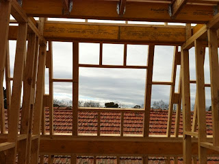 First floor frame and upper roof beams are now mostly up. The rake on the upper eastern side went in, with its spaces for windows and we could see the view that we'll see from the stairwell, and both boys' bedrooms. Tinkered with the size of the skylight over the stairwell too to the full width of the stairwell. Windows and doors were measured, black powdercoated aluminium commercial series in satin, all double glazed. A few weeks before they can be installed. Wrap has gone on around ground floor back room, so it is now looking more like a confined space. Eaves on both sides of ground floor now going up, looks like a bit of a fiddly job. Lots of fixtures and fittings delivered to our place, a bit of a task to check it all, there have been some breakages which needed replacing, and the bath that was delivered is no good at all! Engineer came out to site, that's another whole story. Lots of decisions on air conditioning, bathroom strip drains, stain for timber cladding - another busy week!